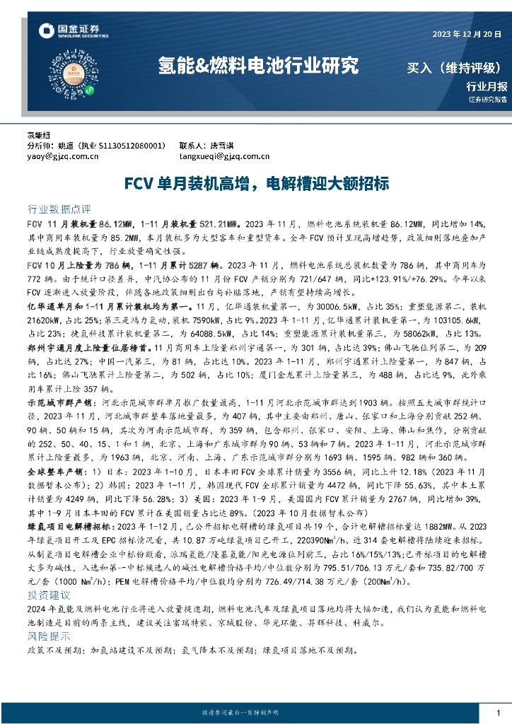 国金证券:氢能&燃料电池行业研究:FCV单月装机高增,电解槽迎大额招标.pdf