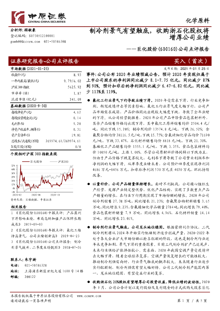 中原证券:巨化股份(600160)-公司点评报告:制冷剂景气有望触底,收购浙石化股权将增厚公司业绩.pdf