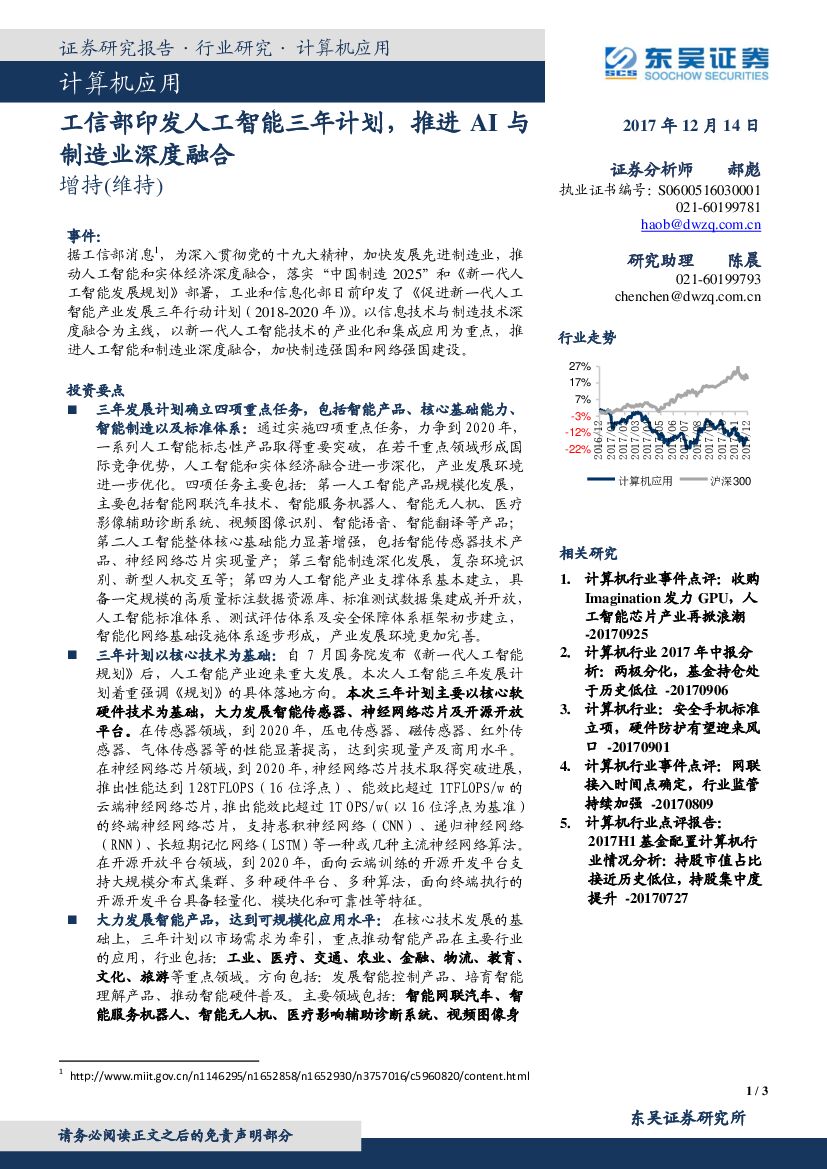 东吴证券:计算机:工信部印发人工智能三年计划,推进AI与制造业深度融合.pdf