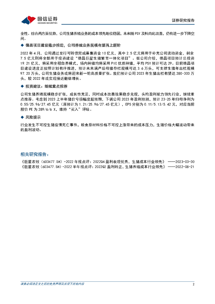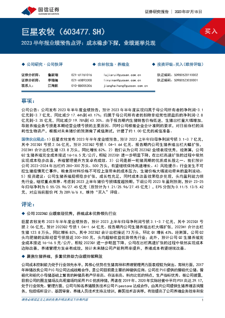 国信证券:巨星农牧(603477)-2023半年报业绩预告点评:成本稳步下探,业绩逐季兑现.pdf