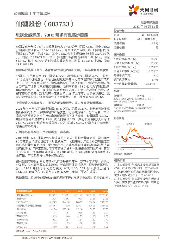 天风证券:仙鹤股份(603733)-短期业绩承压,23H2需求有望逐步回暖.pdf