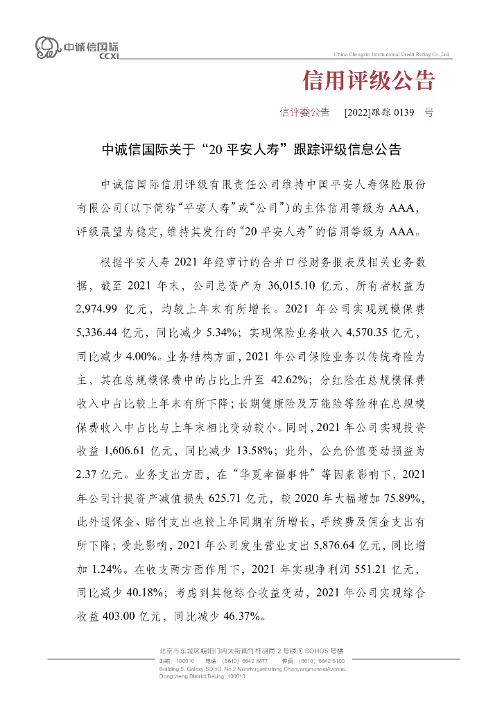 中诚信:中诚信国际关于“20平安人寿”跟踪评级信息公告.pdf