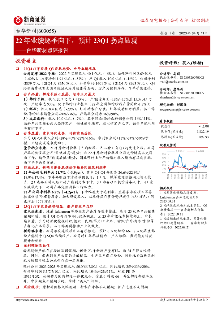 浙商证券:台华新材点评报告:22年业绩逐季向下,预计23Q1拐点显现.pdf