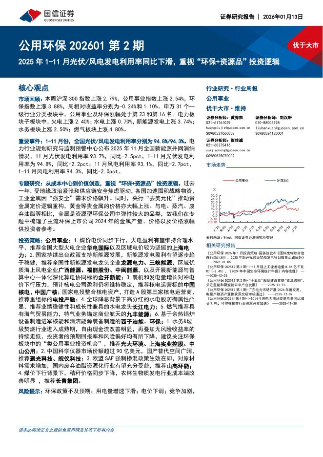 国信证券:公用环保行业202601第2期:2025年1-11月光伏/风电发电利用率同比下滑,重视“环保+资源品”投资逻辑.pdf