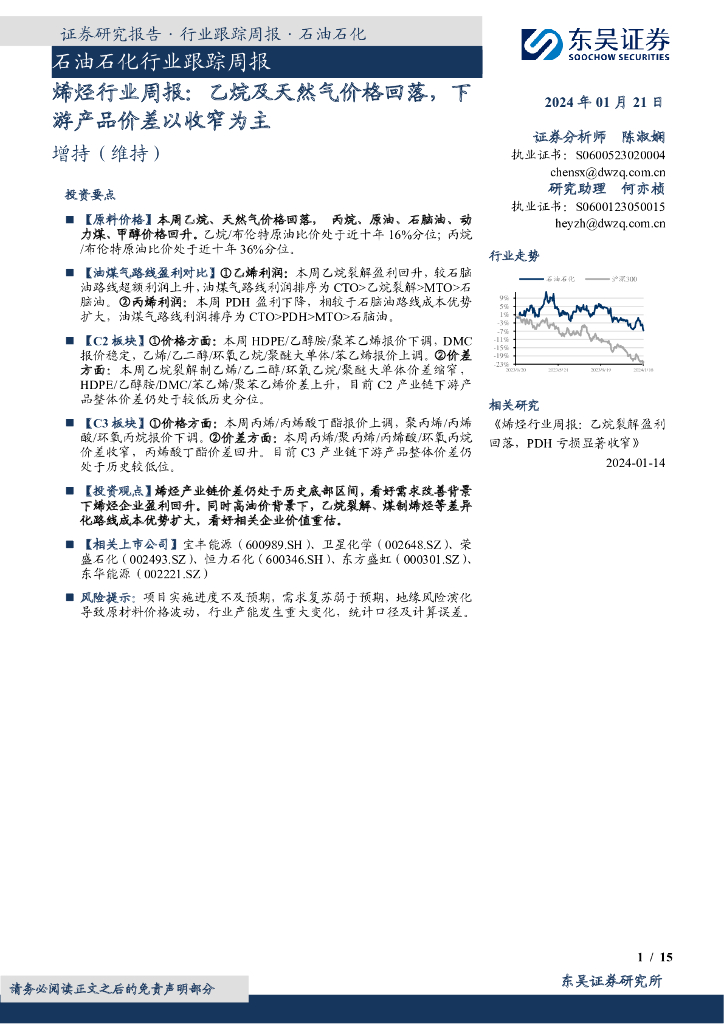 东吴证券:烯烃行业周报:乙烷及天然气价格回落,下游产品价差以收窄为主.pdf