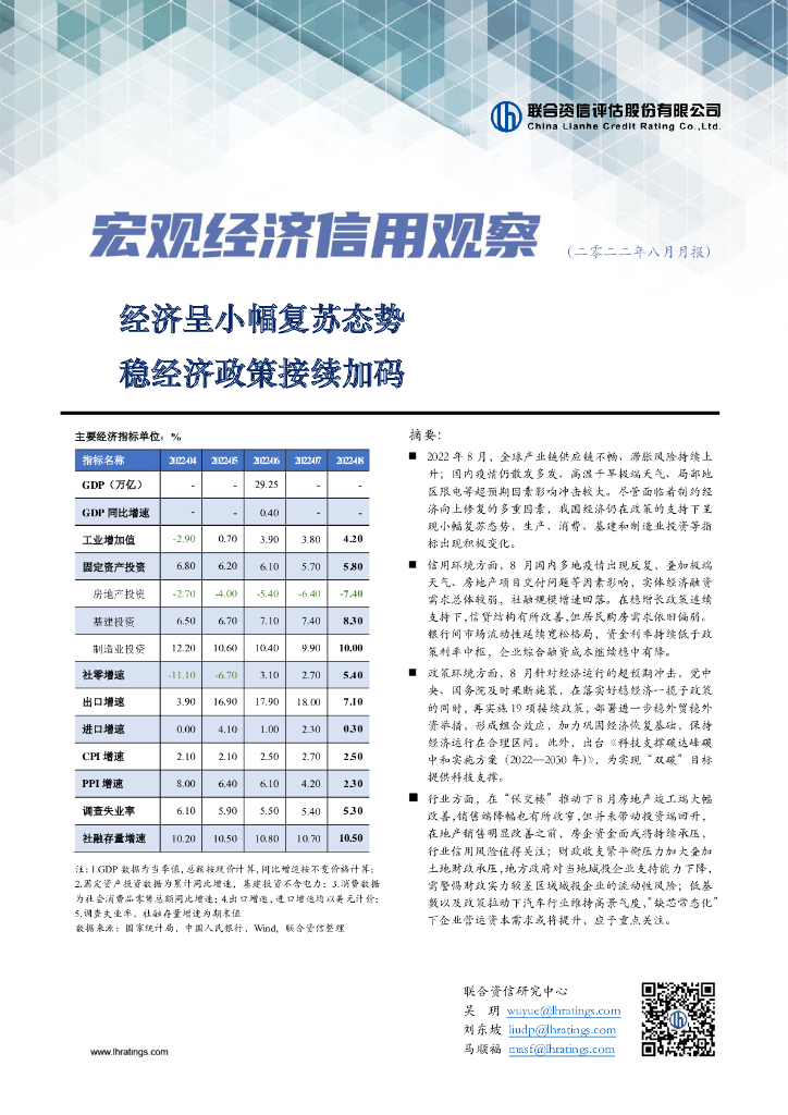 联合资信:经济呈小幅复苏态势,稳经济政策接续加码-宏观经济信用观察月报(2022年8月).pdf