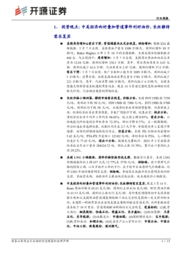 开源证券:石油化工行业周报:经济向好叠加管道事件利好油价,长丝待需求复苏.pdf