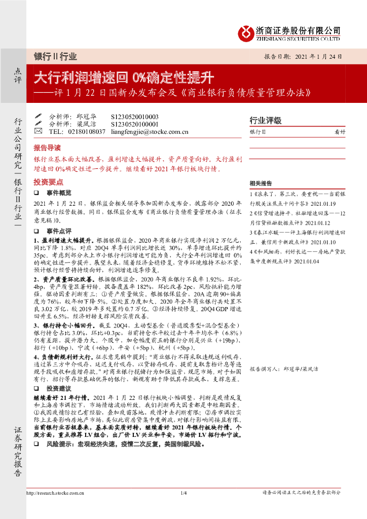 浙商证券:银行Ⅱ行业:评1月22日国新办发布会及《商业银行负债质量管理办法》-大行利润增速回0%确定性提升.pdf