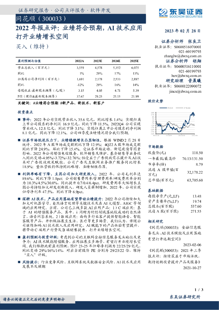 东吴证券:同花顺(300033)-2022年报点评:业绩符合预期,AI技术应用打开业绩增长空间.pdf