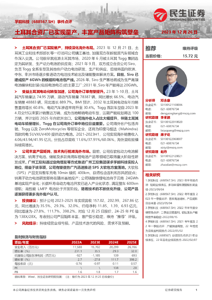 民生证券:孚能科技(688567)-事件点评:土耳其合资厂已实现量产,丰富产品矩阵构筑壁垒.pdf