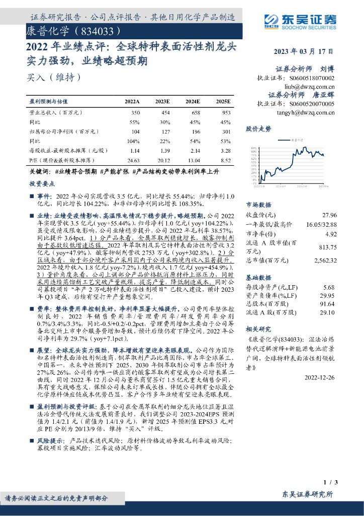 东吴证券:康普化学(834033)-2022年业绩点评:全球特种表面活性剂龙头实力强劲,业绩略超预期.pdf
