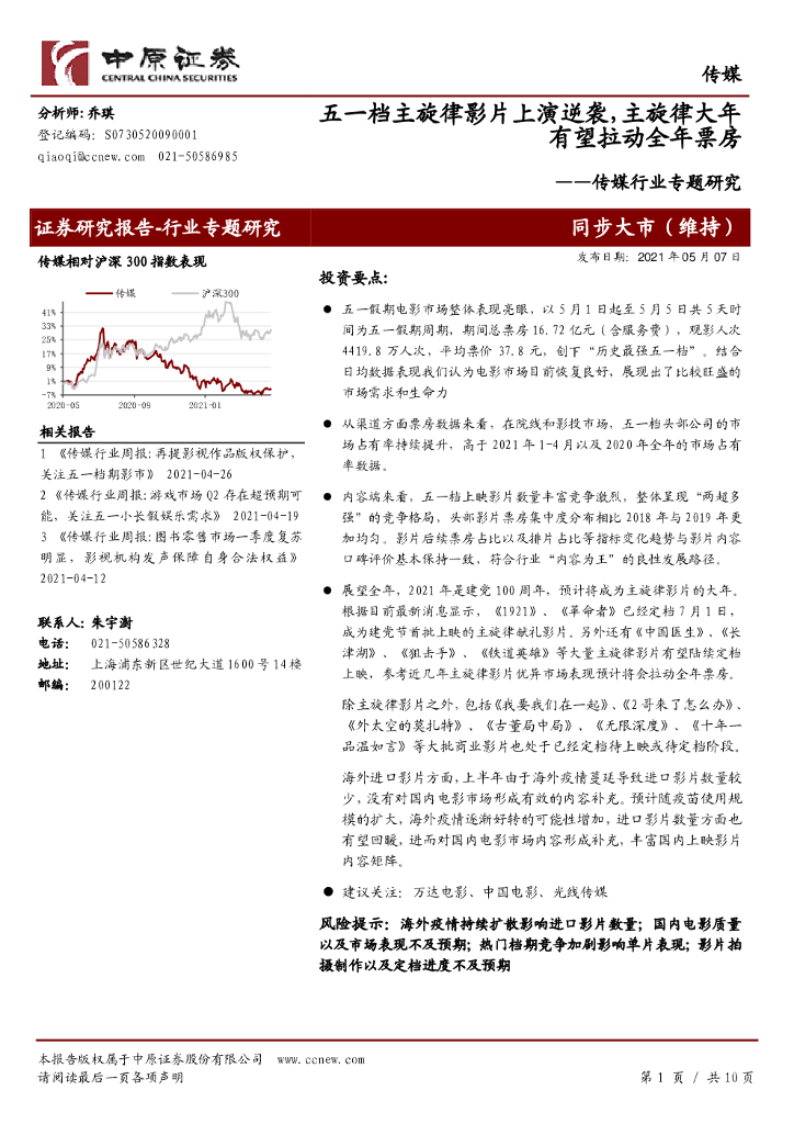 中原证券:传媒行业专题研究:五一档主旋律影片上演逆袭,主旋律大年有望拉动全年票房.pdf