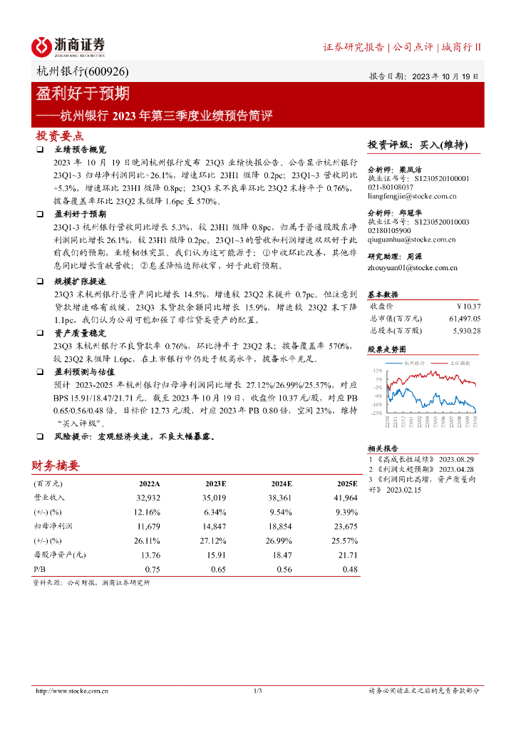 浙商证券:杭州银行2023年第三季度业绩预告简评:盈利好于预期.pdf