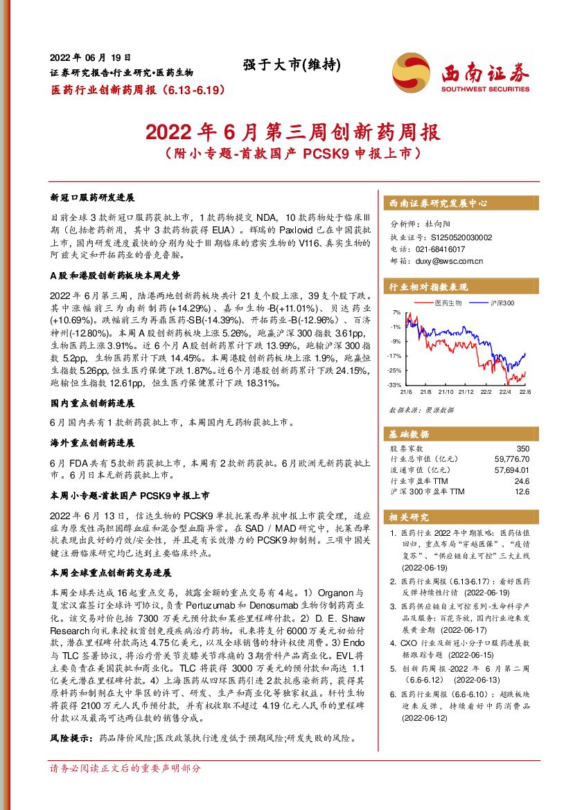 西南证券:医药行业创新药周报:2022年6月第三周创新药周报(附小专题-首款国产PCSK9申报上市).pdf