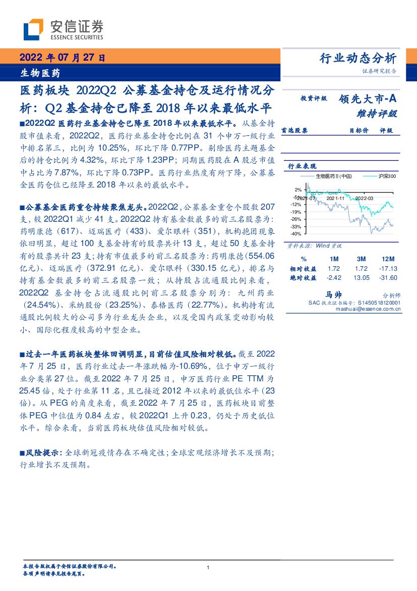 安信证券:医药板块2022Q2公募基金持仓及运行情况分析:Q2基金持仓已降至2018年以来最低水平.pdf