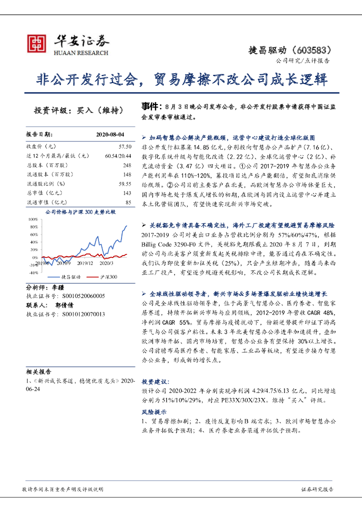 华安证券:捷昌驱动(603583)-非公开发行过会,贸易摩擦不改公司成长逻辑.pdf