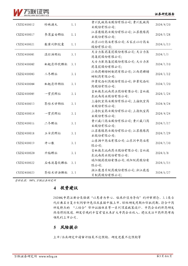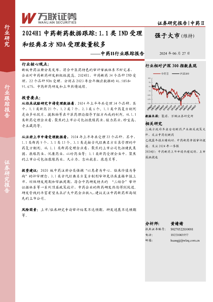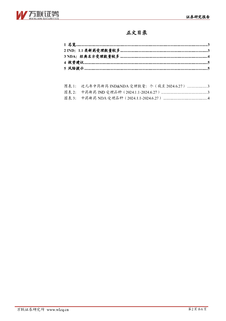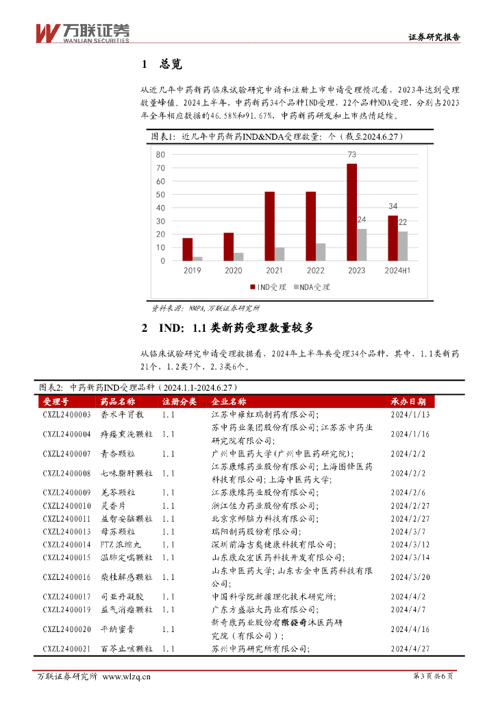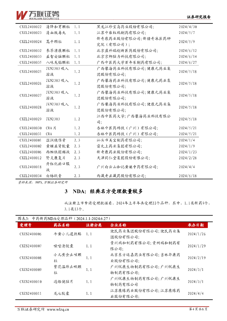 万联证券:中药Ⅱ行业跟踪报告:2024H1中药新药数据跟踪:1.1类IND受理和经典名方NDA受理数量较多.pdf