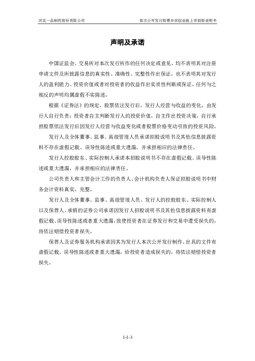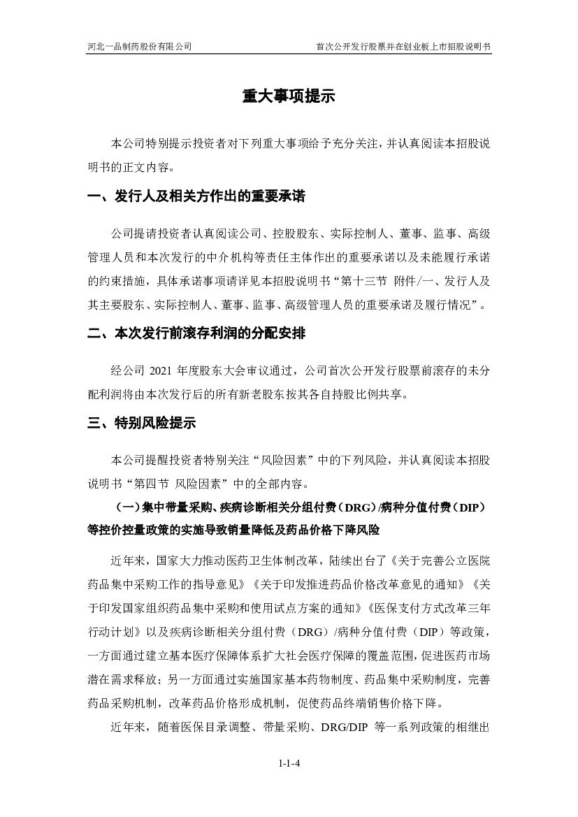 一品制药创业板IPO上市招股说明书:期内毛利率均7成以上处于较高水平.pdf