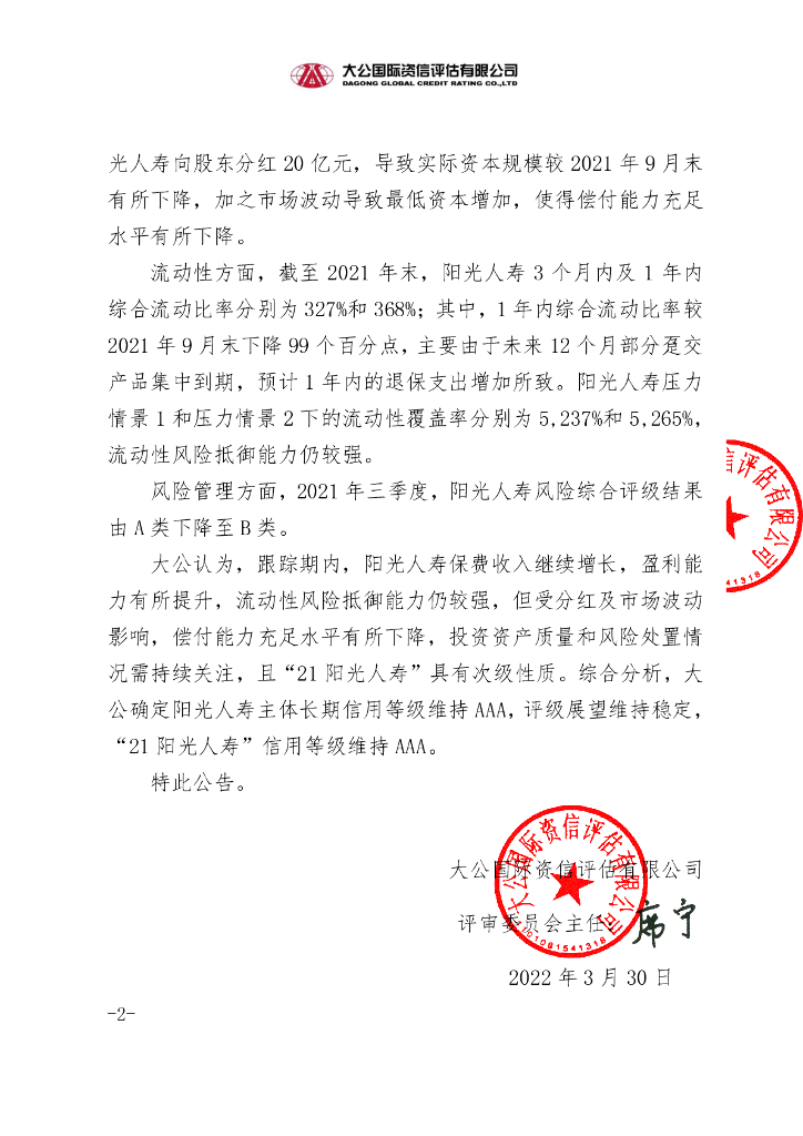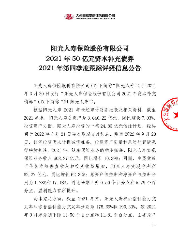 大公:阳光人寿保险股份有限公司2021年50亿元资本补充债券2021年第四季度跟踪评级信息公告.pdf