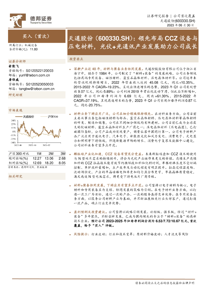 德邦证券:天通股份(600330)-领先布局CCZ设备与压电材料,光伏+光通讯产业发展助力公司成长.pdf