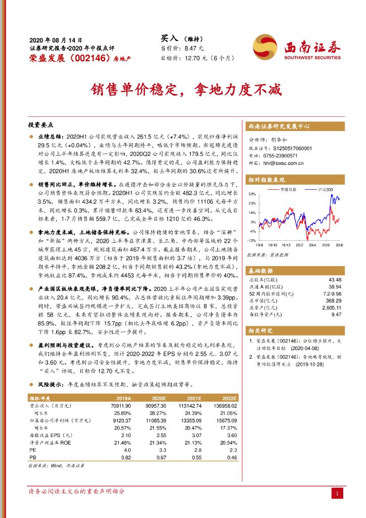 西南证券:荣盛发展(002146)-2020年中报点评:销售单价稳定,拿地力度不减.pdf