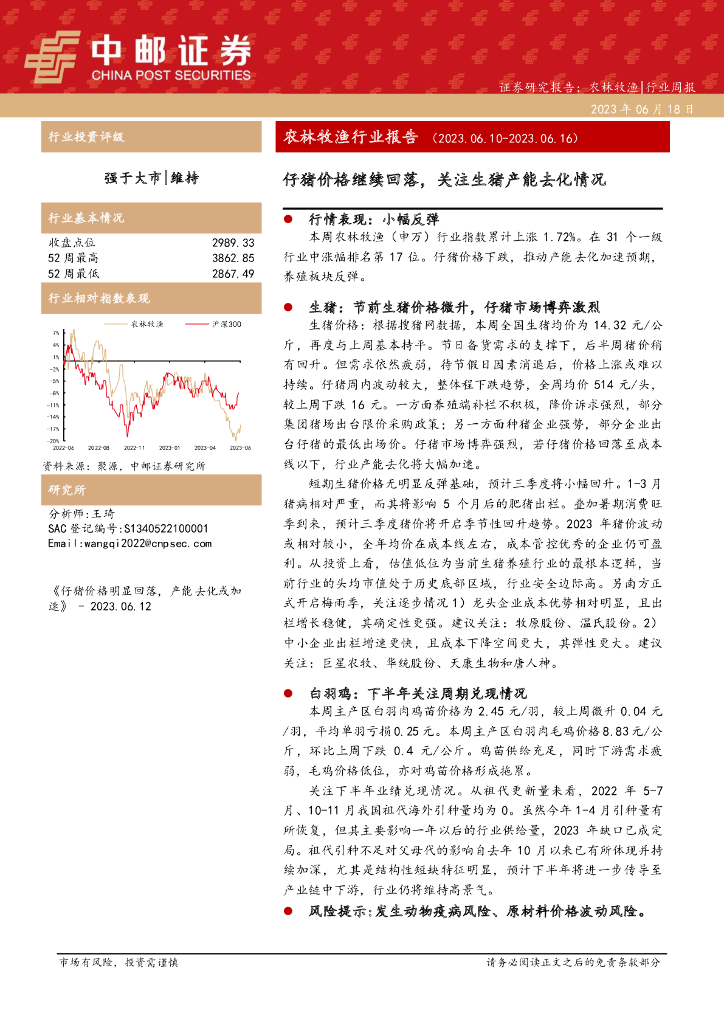 中邮证券:农林牧渔行业报告:仔猪价格继续回落,关注生猪产能去化情况.pdf