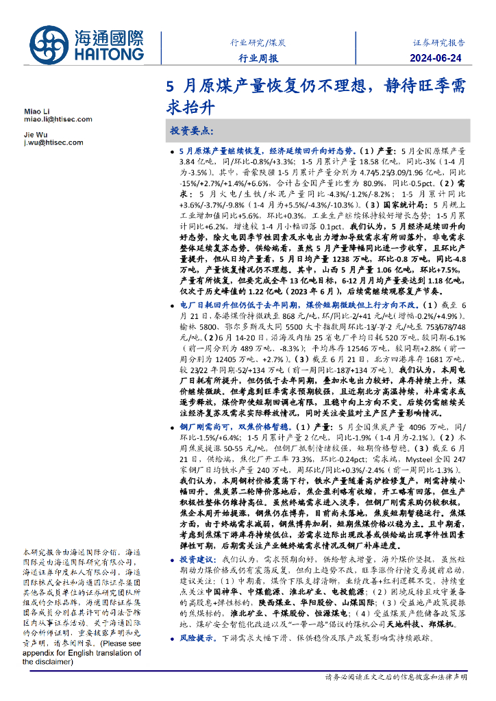 海通国际:煤炭行业周报:5月原煤产量恢复仍不理想,静待旺季需求抬升.pdf