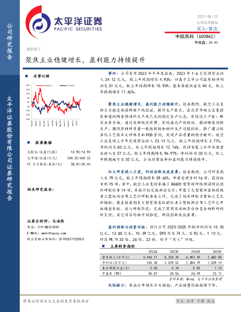 太平洋证券:中航高科(600862)-聚焦主业稳健增长,盈利能力持续提升.pdf