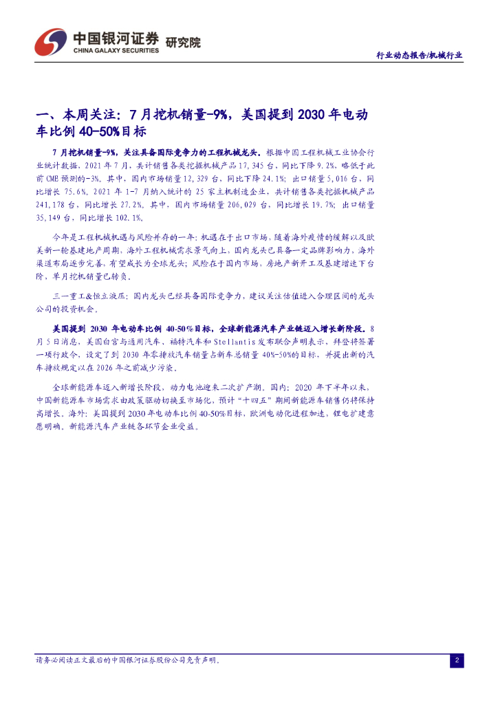 中国银河:机械设备行业周报:7月挖机销量-9%,美国提到2030年电动车比例40-50%目标.pdf