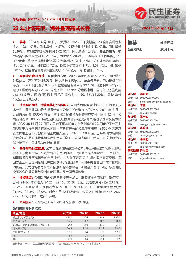 民生证券:华明装备(002270)-2023年年报点评:23年业绩亮眼,海外呈现高成长性.pdf