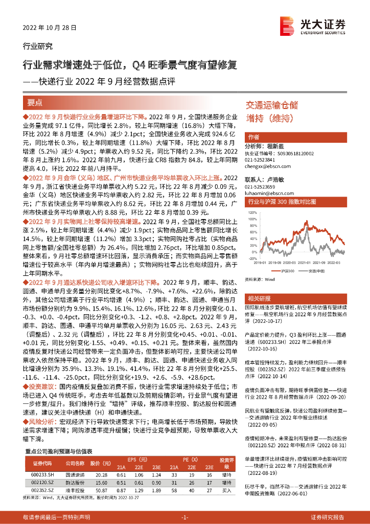 光大证券:快递行业2022年9月经营数据点评:行业需求增速处于低位,Q4旺季景气度有望修复.pdf