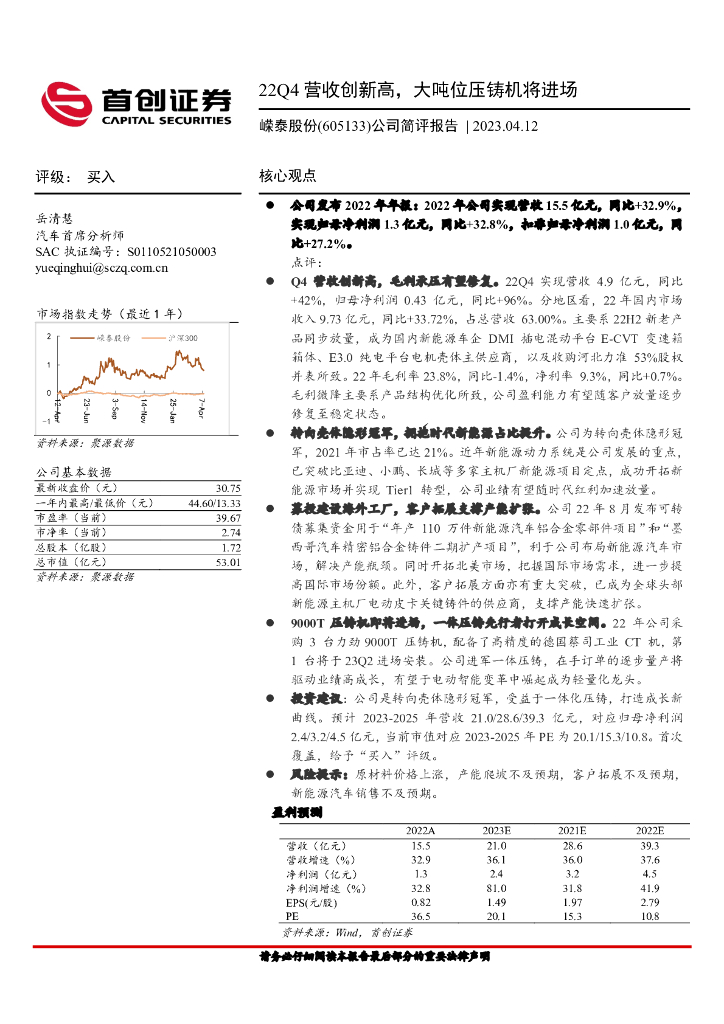 首创证券:嵘泰股份(605133)-公司简评报告:22Q4营收创新高,大吨位压铸机将进场.pdf