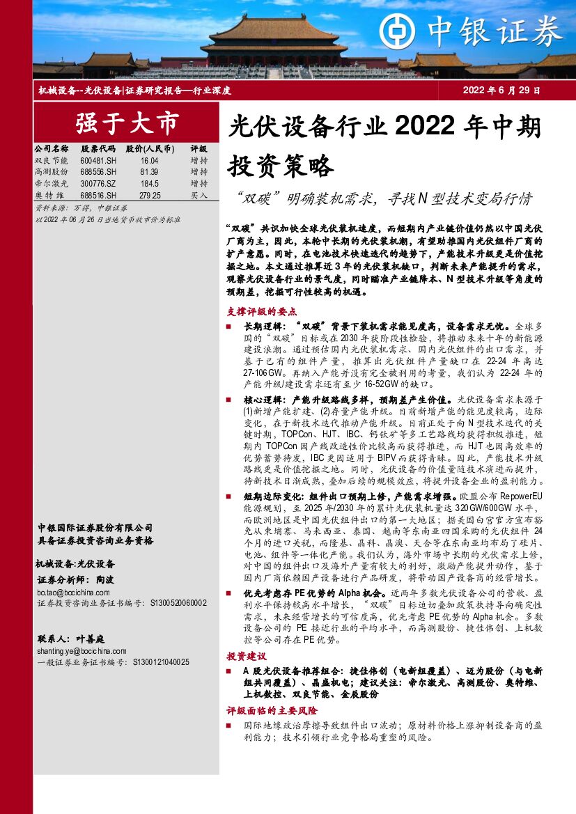 中银证券:光伏设备行业2022年中期投资策略:“双碳”明确装机需求,寻找N型技术变局行情.pdf