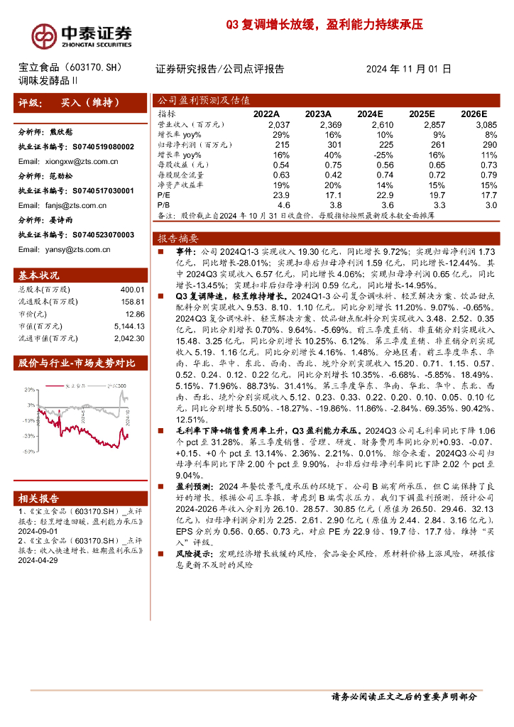 中泰证券:宝立食品(603170)-Q3复调增长放缓,盈利能力持续承压.pdf