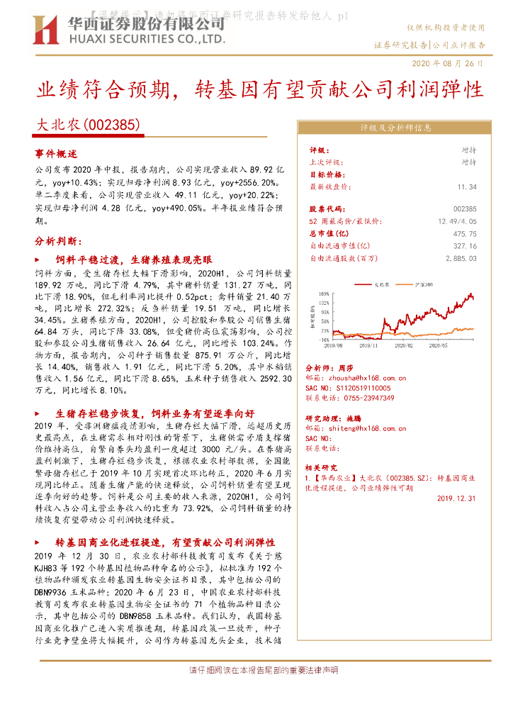 华西证券:大北农(002385)-业绩符合预期,转基因有望贡献公司利润弹性.pdf