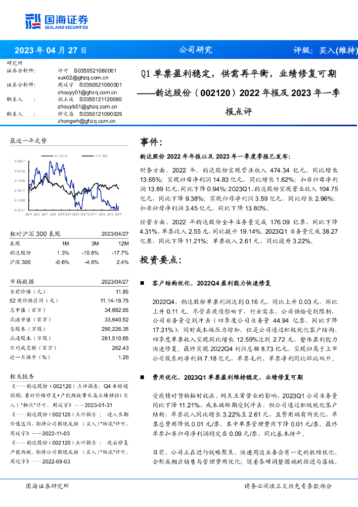 国海证券:韵达股份(002120)-2022年报及2023年一季报点评:Q1单票盈利稳定,供需再平衡,业绩修复可期.pdf