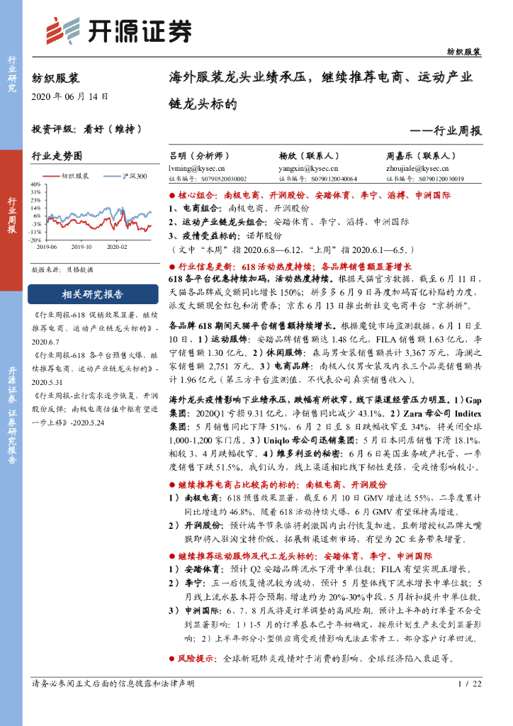 开源证券:纺织服装行业周报:海外服装龙头业绩承压,继续推荐电商、运动产业链龙头标的.pdf