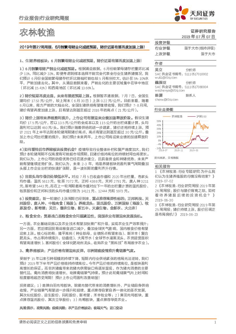 天风证券:农林牧渔2019年第27周周报:6月能繁母猪去化或超预期,猪价近期有望再度加速上涨!.pdf