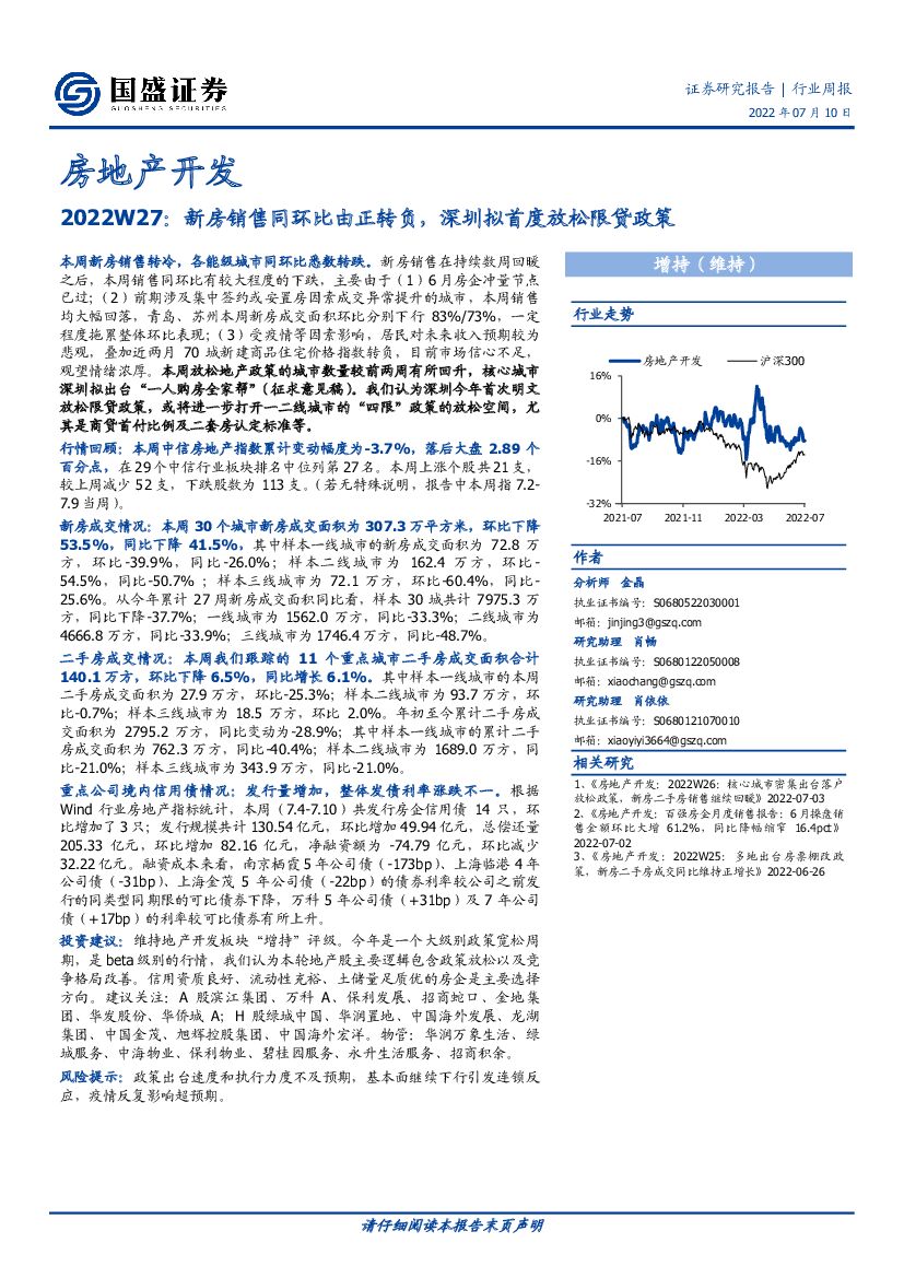 国盛证券:房地产开发2022W27:新房销售同环比由正转负,深圳拟首度放松限贷政策.pdf