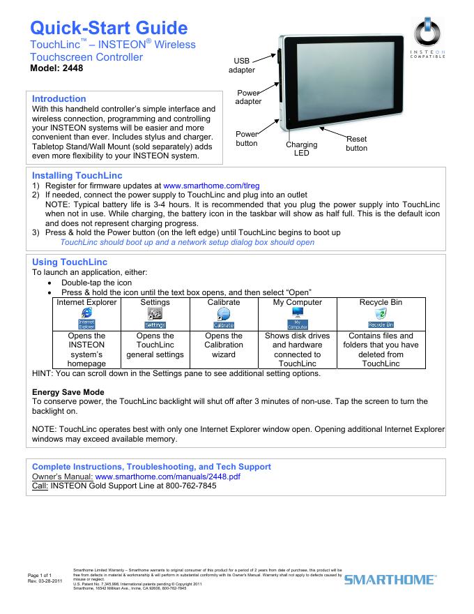 TouchLinc™ – INSTEON® Wireless Touchscreen Controller 快速入门指南.pdf