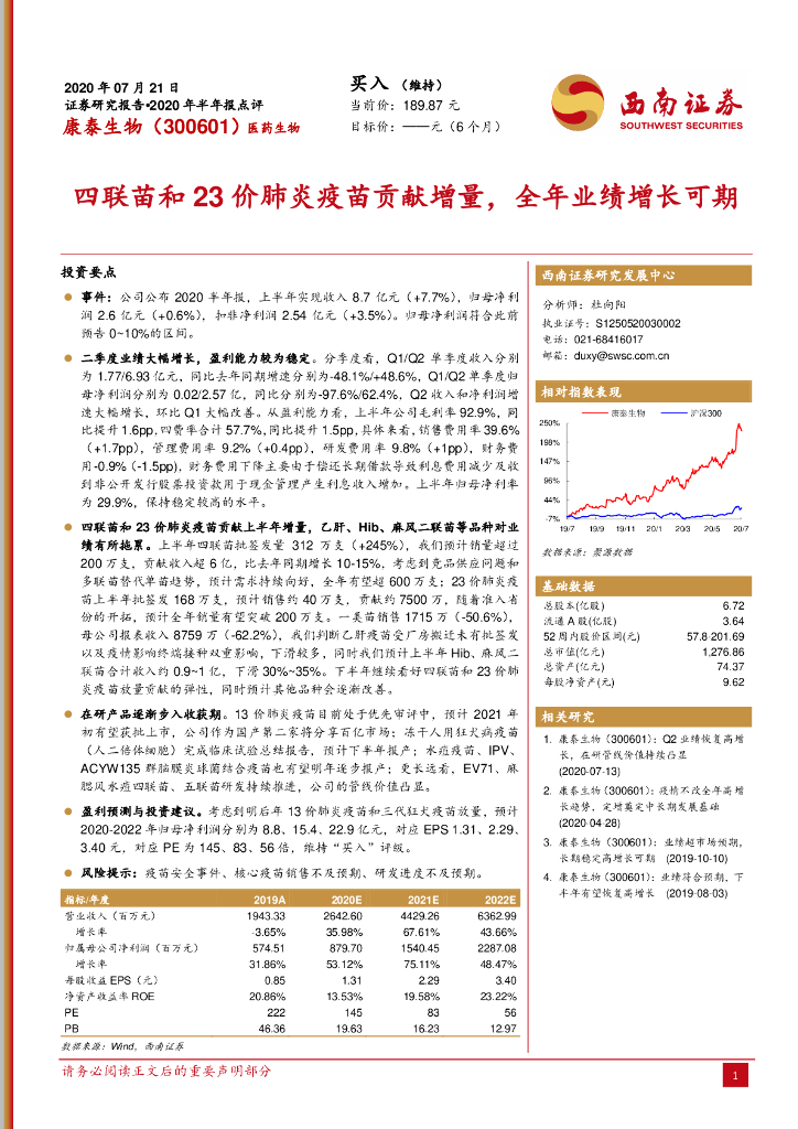 西南证券:康泰生物(300601)-四联苗和23价肺炎疫苗贡献增量,全年业绩增长可期.pdf