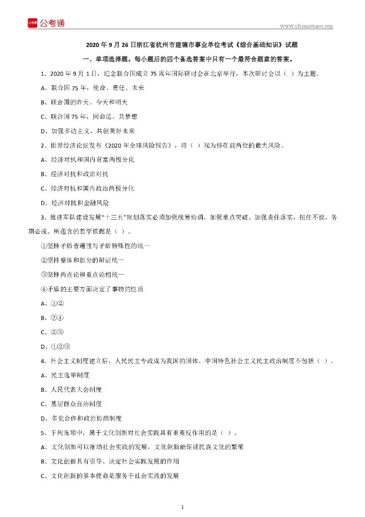 2020年9月26日浙江省杭州市建德市事业单位考试《综合基础知识》试题.pdf