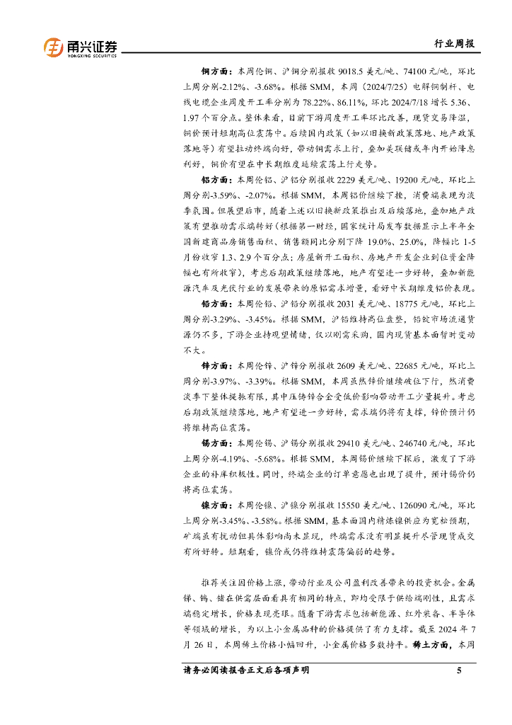 甬兴证券:有色行业周报:以旧换新及设备更新新政策推出,看好终端需求向好.pdf
