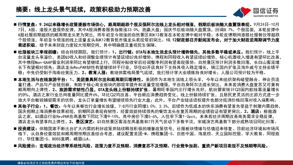 国信证券:社会服务行业10月投资策略暨三季报前瞻:线上龙头景气延续,政策积极助力预期改善.pdf