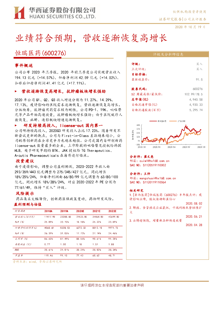 华西证券:恒瑞医药(600276)-业绩符合预期,营收逐渐恢复高增长.pdf