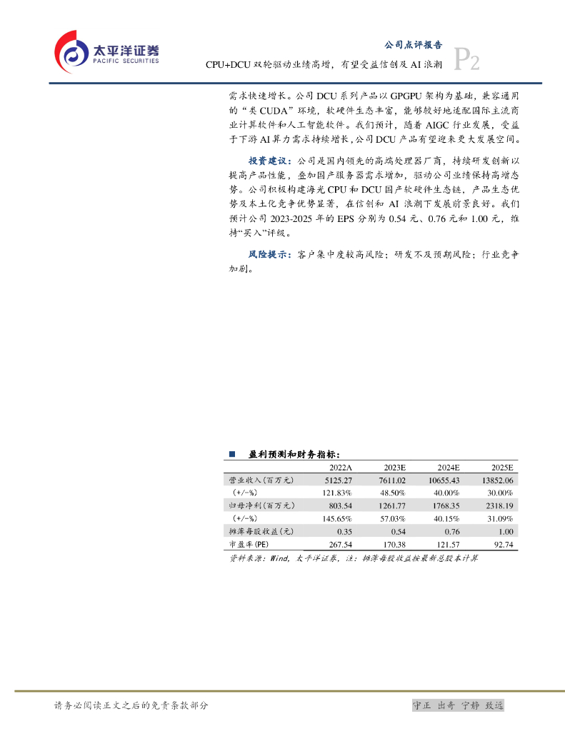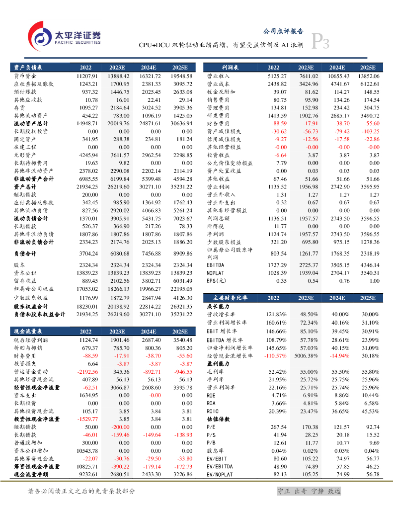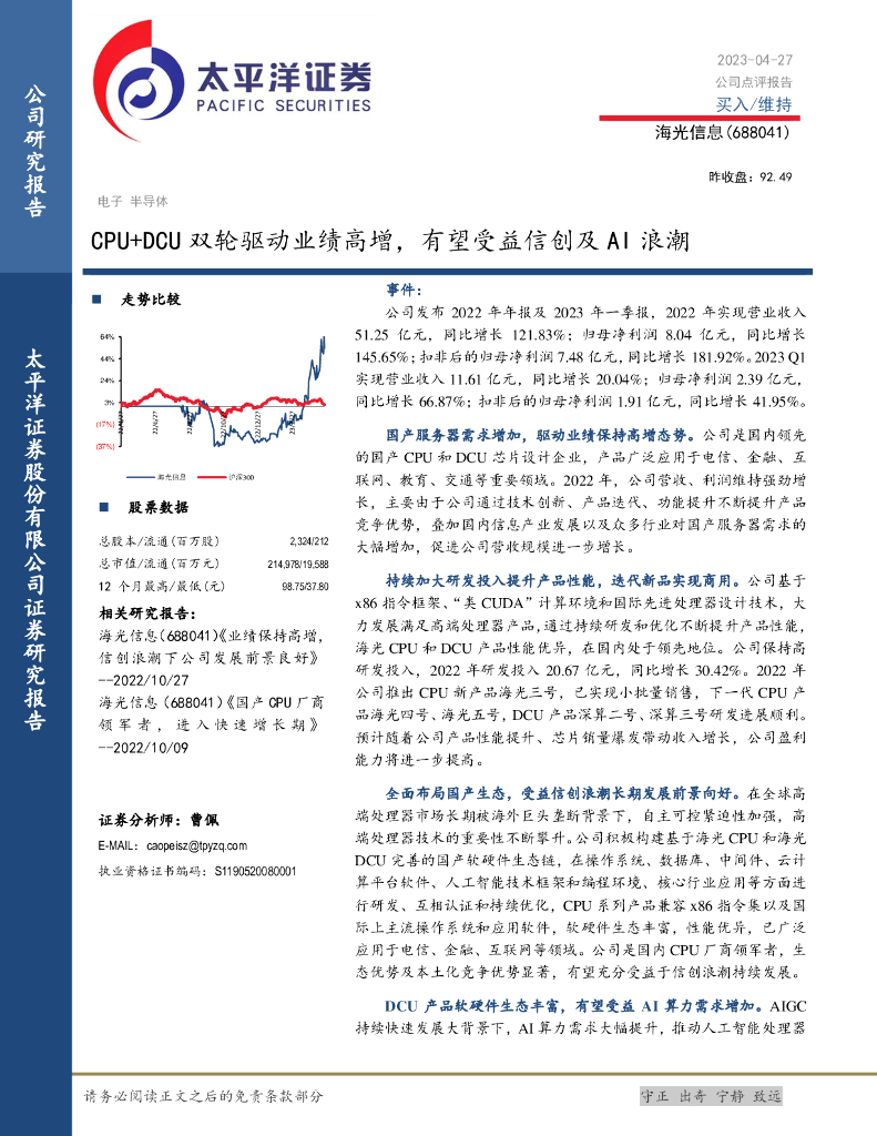 太平洋证券:海光信息(688041)-CPU+DCU双轮驱动业绩高增,有望受益信创及AI浪潮.pdf