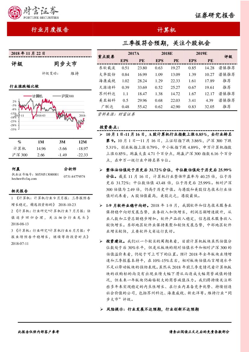 财富证券:计算机行业月度报告:三季报符合预期,关注个股机会.pdf