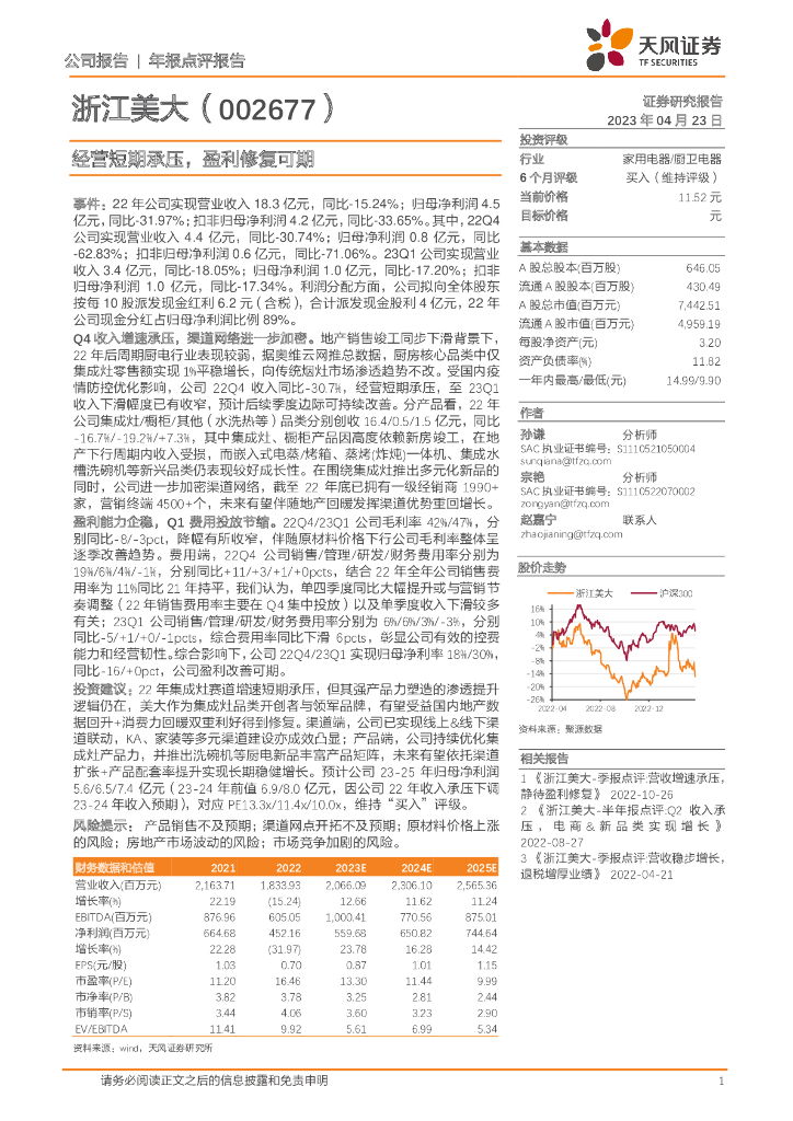 天风证券:浙江美大(002677)-经营短期承压,盈利修复可期.pdf