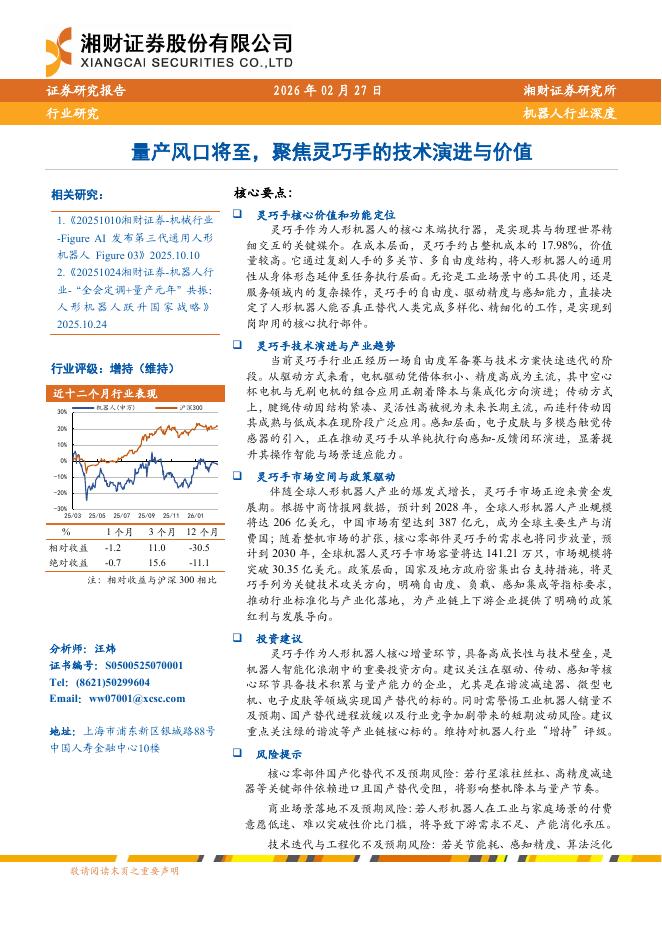 湘财证券:机器人行业深度:量产风口将至,聚焦灵巧手的技术演进与价值.pdf