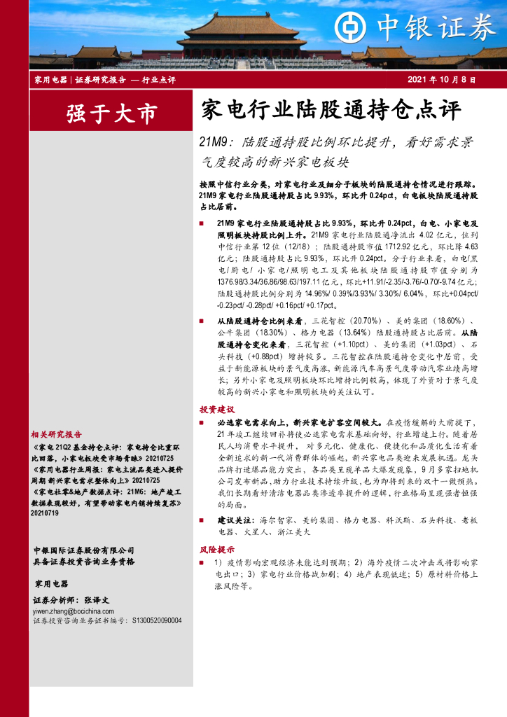 中银证券:家电行业陆股通持仓点评:21M9:陆股通持股比例环比提升,看好需求景气度较高的新兴家电板块.pdf